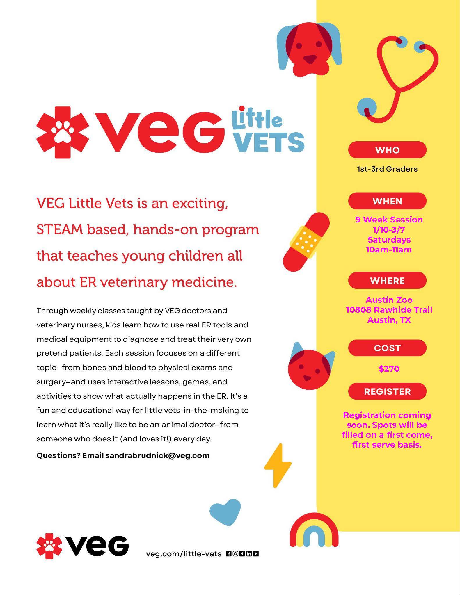 We are so excited to share with you that we are bringing a new class to Austin Zoo in the winter! We are partnering with VEG ER for Pets to introduce a program centered around teaching young children all about ER emergency medicine for animals – Little Vets.